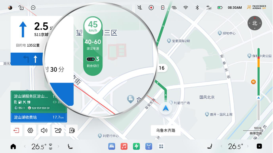 此外,导航与娱乐功能也进行了重点优化(支持 24/25 款 ES 纯电、24 款 ET)。中控屏实现了导航与娱乐分屏显示,用户可通过三指滑动自由切换布局,同时查看导航信息与音乐界面。高德导航界面新增实时显示红灯倒计时秒数,让用户提前做好起步准备,精准预判通行时间;绿波路段功能的加入,为用户提供特定路段的连续绿灯通行建议车速,有效减少停车等待时间,提升出行效率;熟路推荐功能则根据用户的常用路线,在路线规划中展示最近走过的路线推荐,方便用户快速导航。