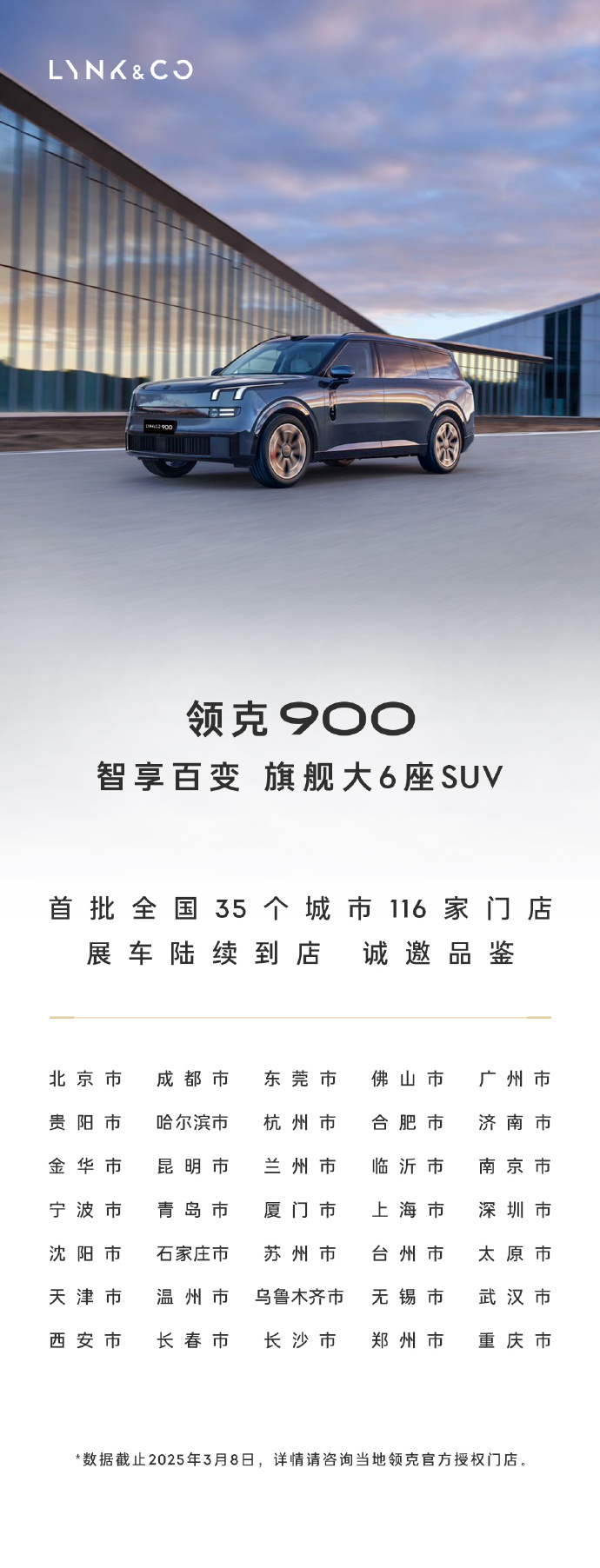 IT之家 3 月 10 日消息,领克 900 旗舰 SUV 将于今年第二季度上市,现在这款展车陆续到店,首批全国 35 个城市 116 家门店。