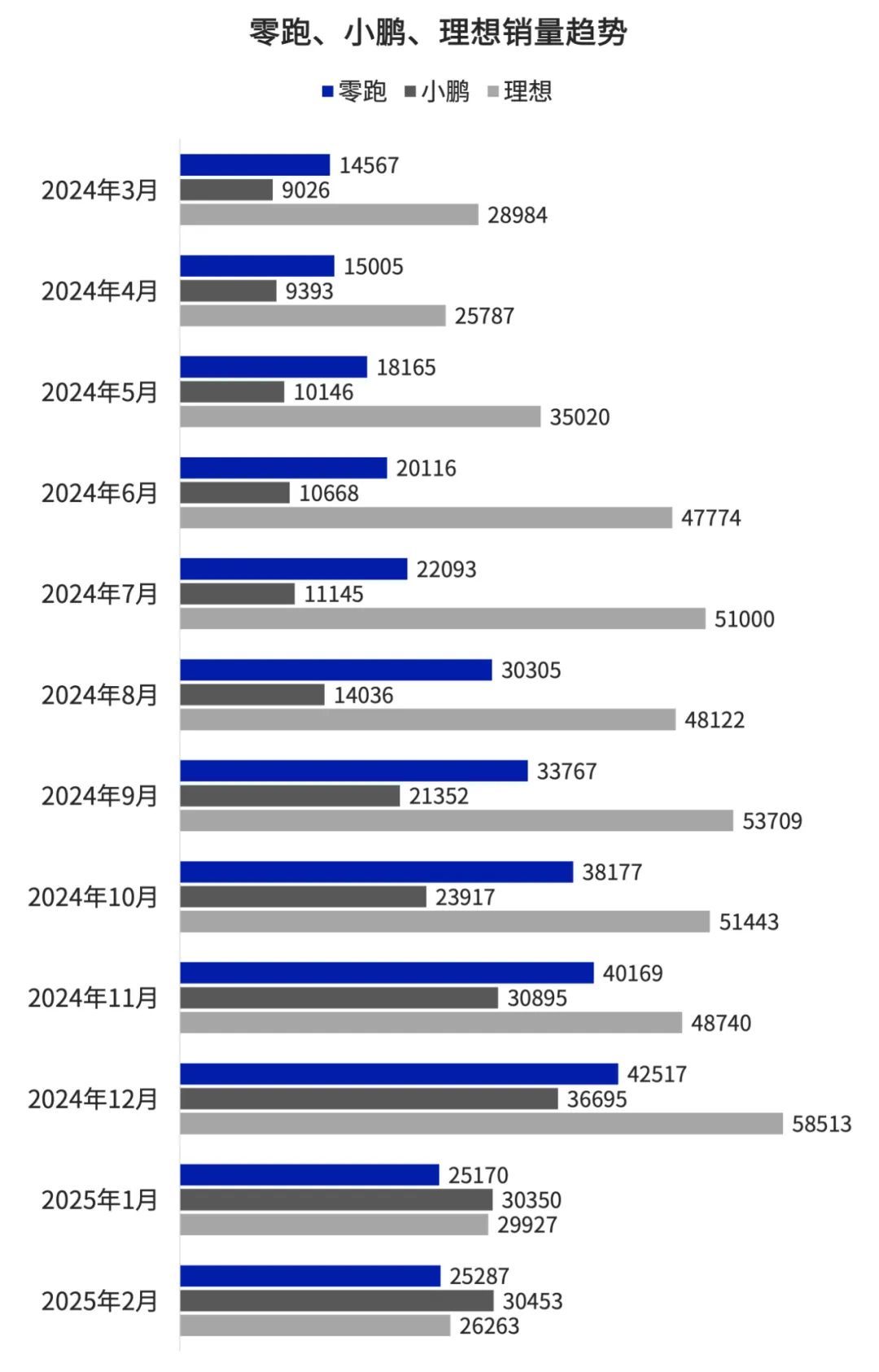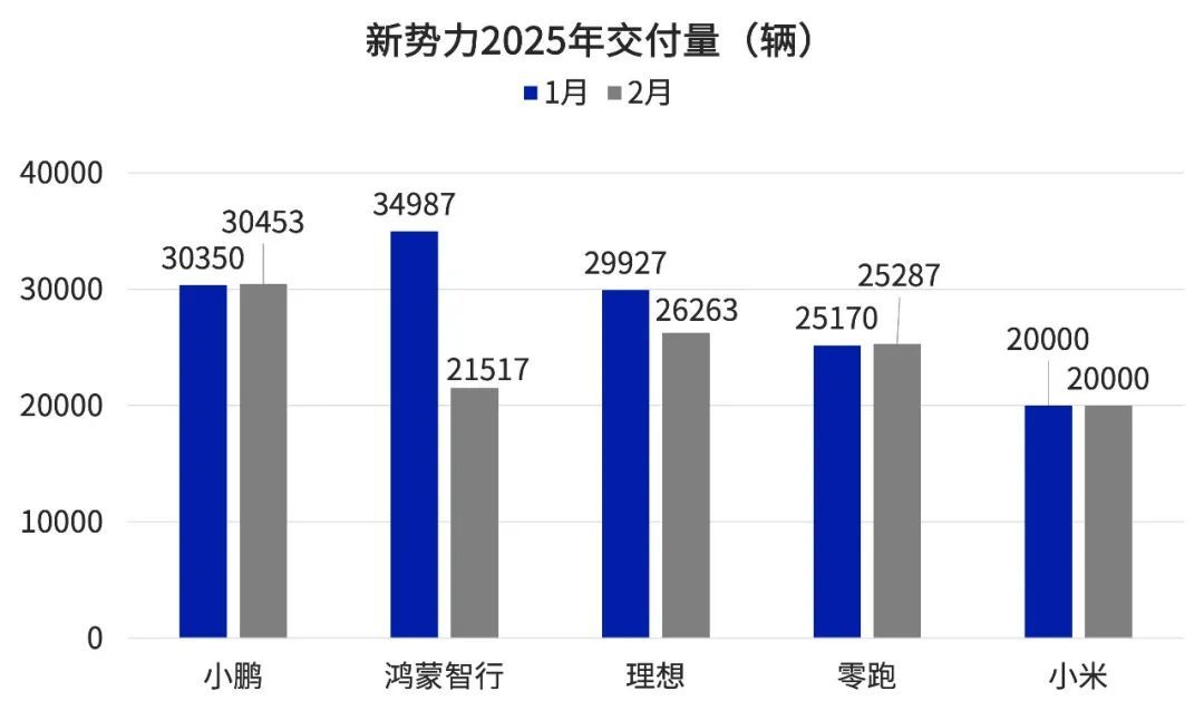 1月,理想销量29927,掉到了新势力第三名,排在鸿蒙智行(华为系)、小鹏之后;2月,理想销量26263,排名第二,第一是小鹏。