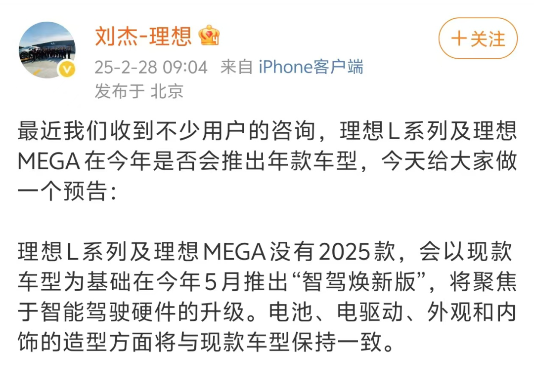 理想销量不佳,还有个原因——很多用户不确定理想L系列车型会不会改款,所以选择观望。为了打消疑虑,理想副总裁刘杰前几天发微博说:不会推2025款,但会有焕新版,主要是升级智能驾驶硬件,推出时间是在5月。