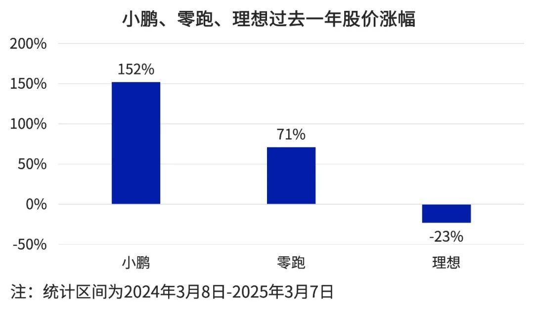 过去一年,小鹏股价已经上涨了152%,零跑股价上涨了71%。理想的股价,则跌了23%。