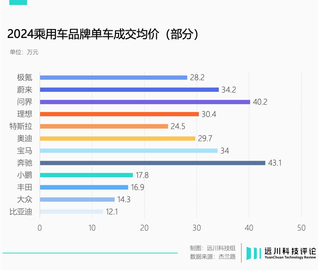 依靠对供应链的垂直整合和优于同行的成本管理能力,比亚迪在均价15万级实现了超过20%的毛利率。但从绝对值看,去年比亚迪新车成交单价在12万元左右[4],相比丰田的17万稍低,跟理想的30万比相去甚远。