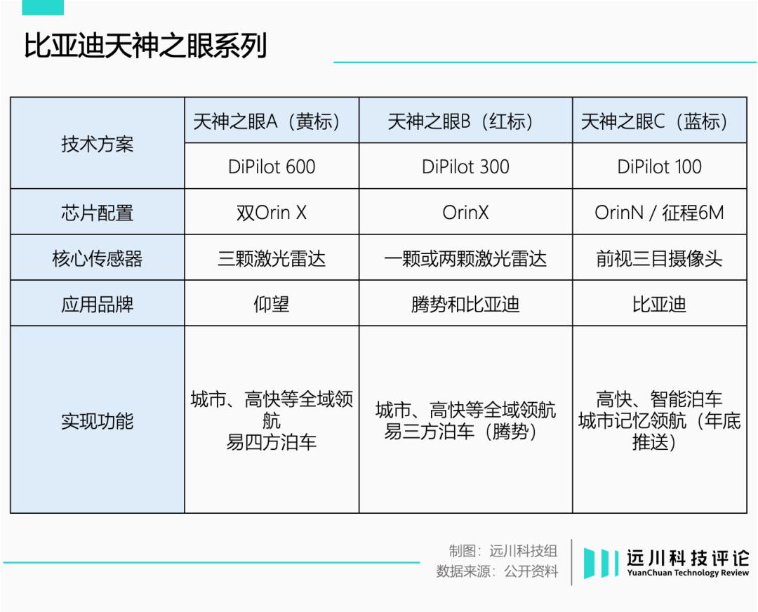 比亚迪天神之眼分为A/B/C三套方案,按照芯片算力和传感器配置不同,可以实现不同等级的智驾功能。