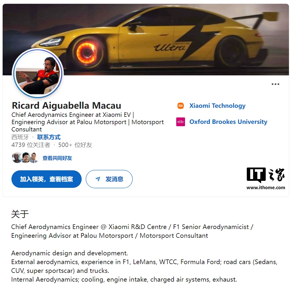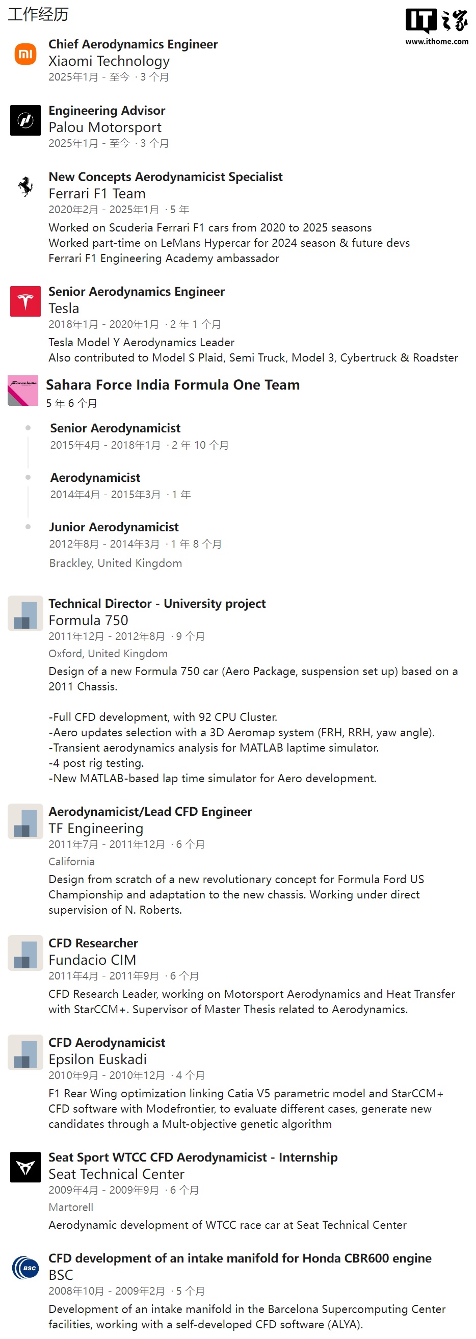 IT之家 3 月 10 日消息,领英页面显示,法拉利 F1 空气动力学家 Ricard Aiguabella Macau 加盟小米,担任首席空气动力学工程师。