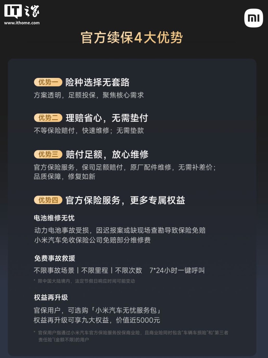 IT之家参考相应指南,小米表示用户选择官方续保可享受“电池维修无忧”体验,即如果汽车动力电池事故受损,因迟报案或缺现场查勘导致保险免赔,小米汽车免收保险公司免赔部分维修费。