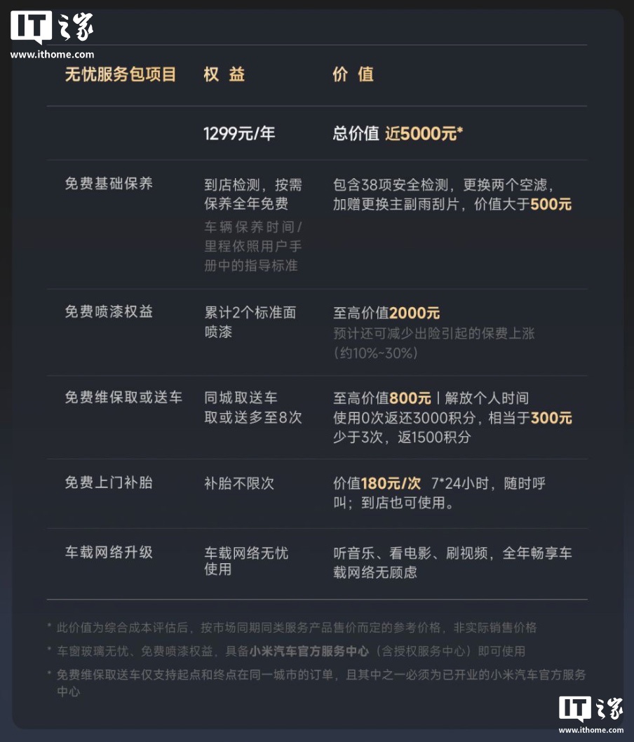 此外,小米还表示可为官方续保用户提供“不限事故场景、不限里程、不限次数”的 7*24 小时一键呼叫免费事故救援。同时官保用户还可以加购 1299 元“小米汽车无忧服务包”,获得免费基础保养、免费喷漆、免费维保取送车、免费上门补胎、车载网络升级服务。