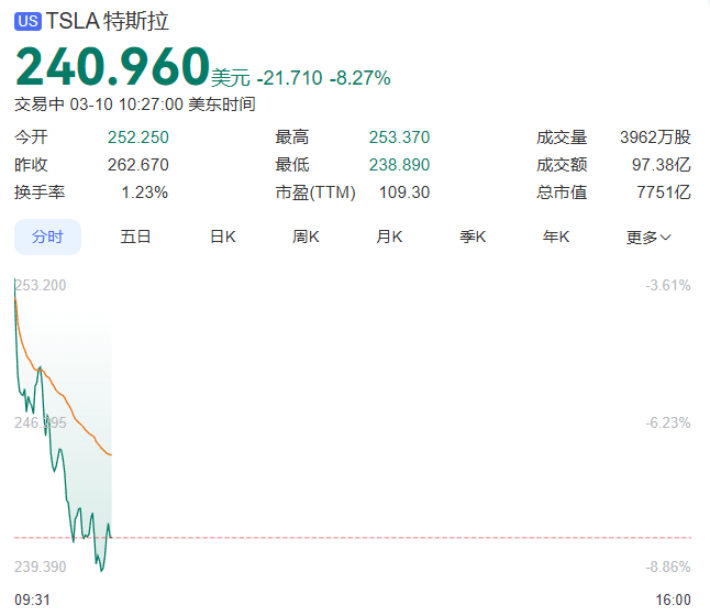 IT之家 3 月 10 日消息,在今日的盘中交易中,特斯拉股价出现显著波动,截至IT之家发稿时,股价下挫幅度已超 8%,跌破 241 美元 / 股。与特斯拉股票的历史最高价 488.54 美元相比,当前股价已近乎“腰斩”。