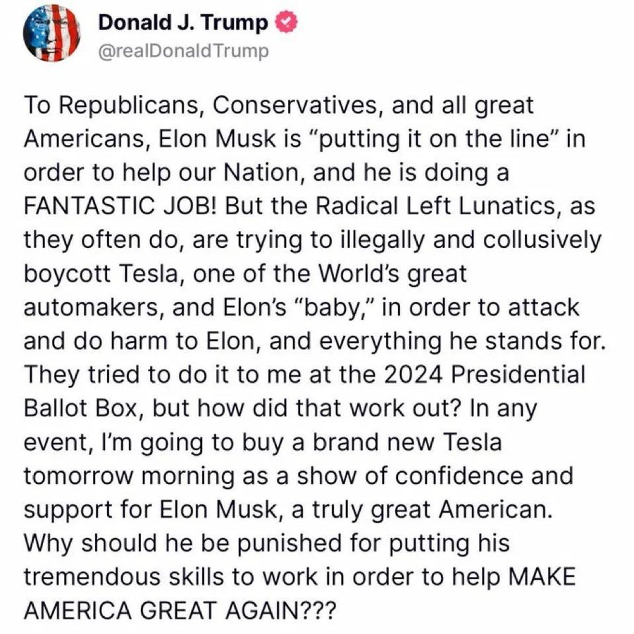 特朗普在华盛顿午夜刚过后发帖称,他将在“明天早上”购买一辆新的特斯拉,以“表明对伊隆·马斯克的信任和支持,他是一位真正伟大的美国人。他用自己非凡的技能帮助美国再次伟大,为什么要受到惩罚??”特朗普没有具体说明他将购买哪款特斯拉车型。(作者/陈俊熹)