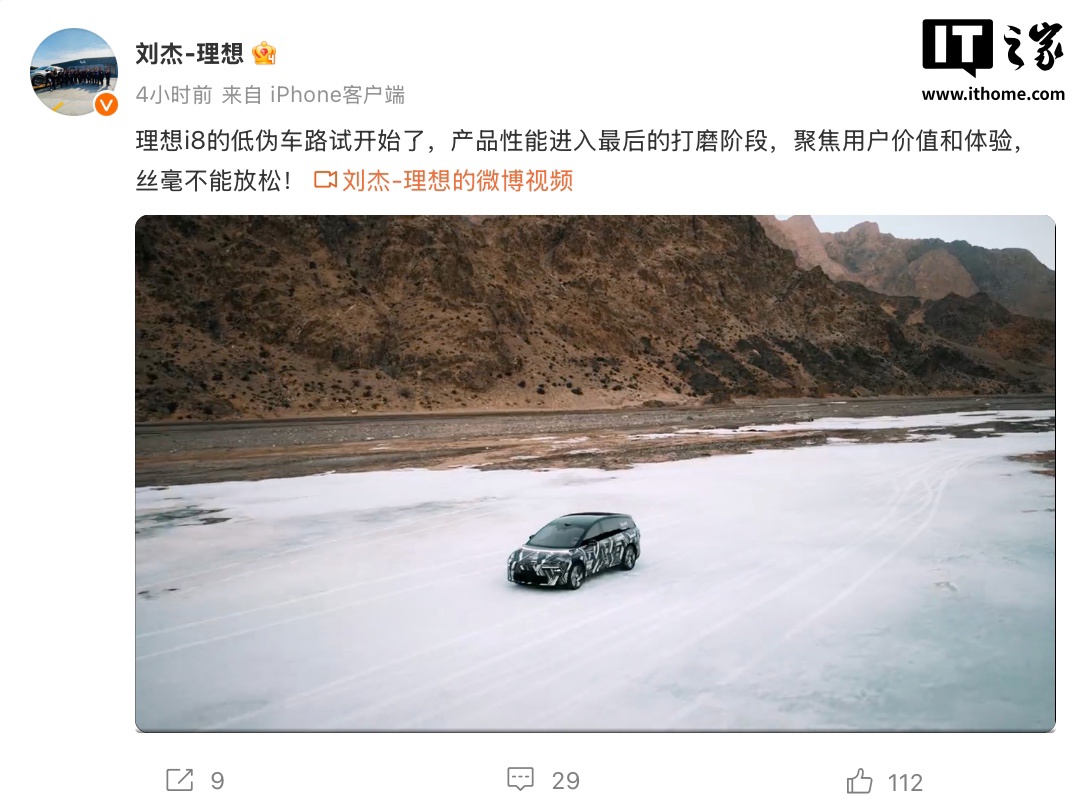 IT之家 3 月 11 日消息,理想汽车副总裁刘杰发文,透露理想旗下首款纯电 SUV—— 理想 i8 的低伪车路试已开始,相应产品性能进入最后的打磨阶段。