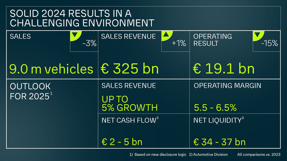 展望 2025 年,大众汽车集团预计销售收入将比 2024 年增长 5%;集团的销售运营回报率预计在 5.5% 到 6.5% 之间。