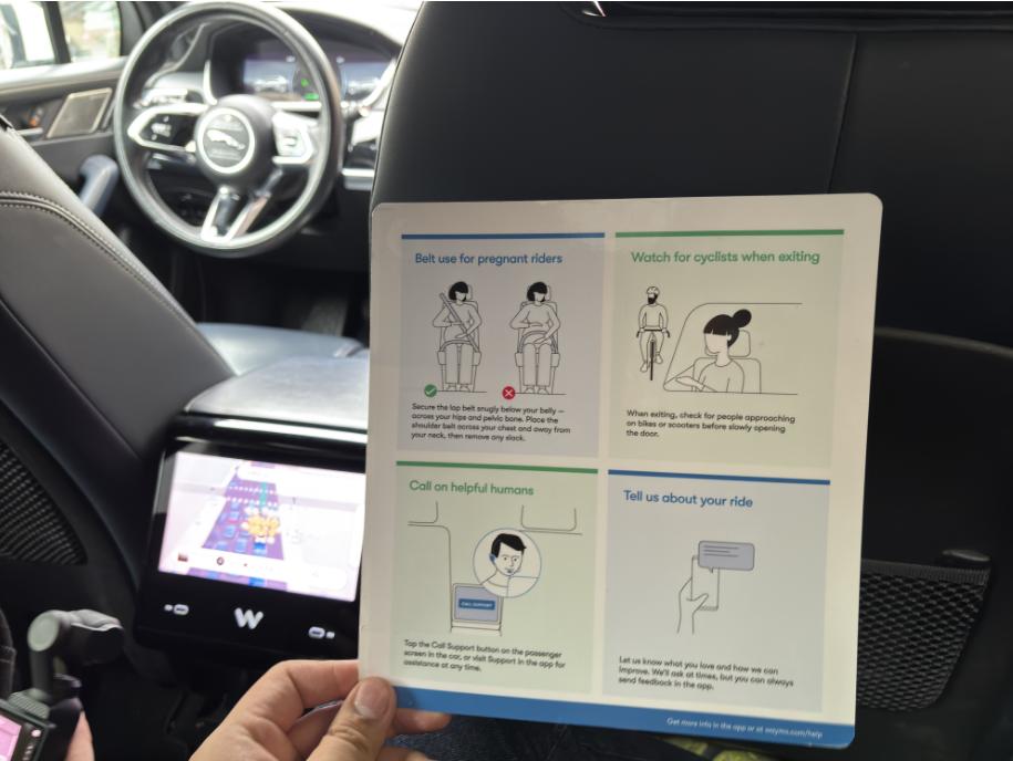 Waymo整体流程跟小雷体验的萝卜快跑等相似,不过跟国内的RoboTaxi驾驶座会坐着一位“木头人”(安全员)不同,Waymo主驾位置没人。根据车上提供的告示牌,Waymo最多支持四人同时乘坐,不允许用户坐到主驾驶位上,或许是怕被某些不怀好意的人群抢夺方向盘做一些危险的事情,以及难以确定事故责任。在车上,Waymo还准备了类似乘坐飞机的“安全说明书”,还是蛮贴心的。