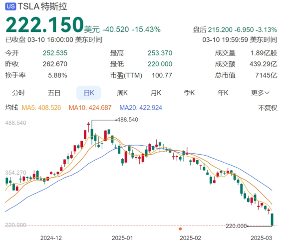 3月10日,特斯拉股价重挫15%