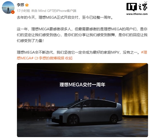 IT之家 3 月 12 日消息,3 月 11 日是理想 MEGA 交付一周年的日子,理想汽车 CEO 李想发文对用户表示感谢,并称“理想 MEGA 会不断迭代,我们坚信它一定会成为最好的家庭 MPV,没有之一。”。