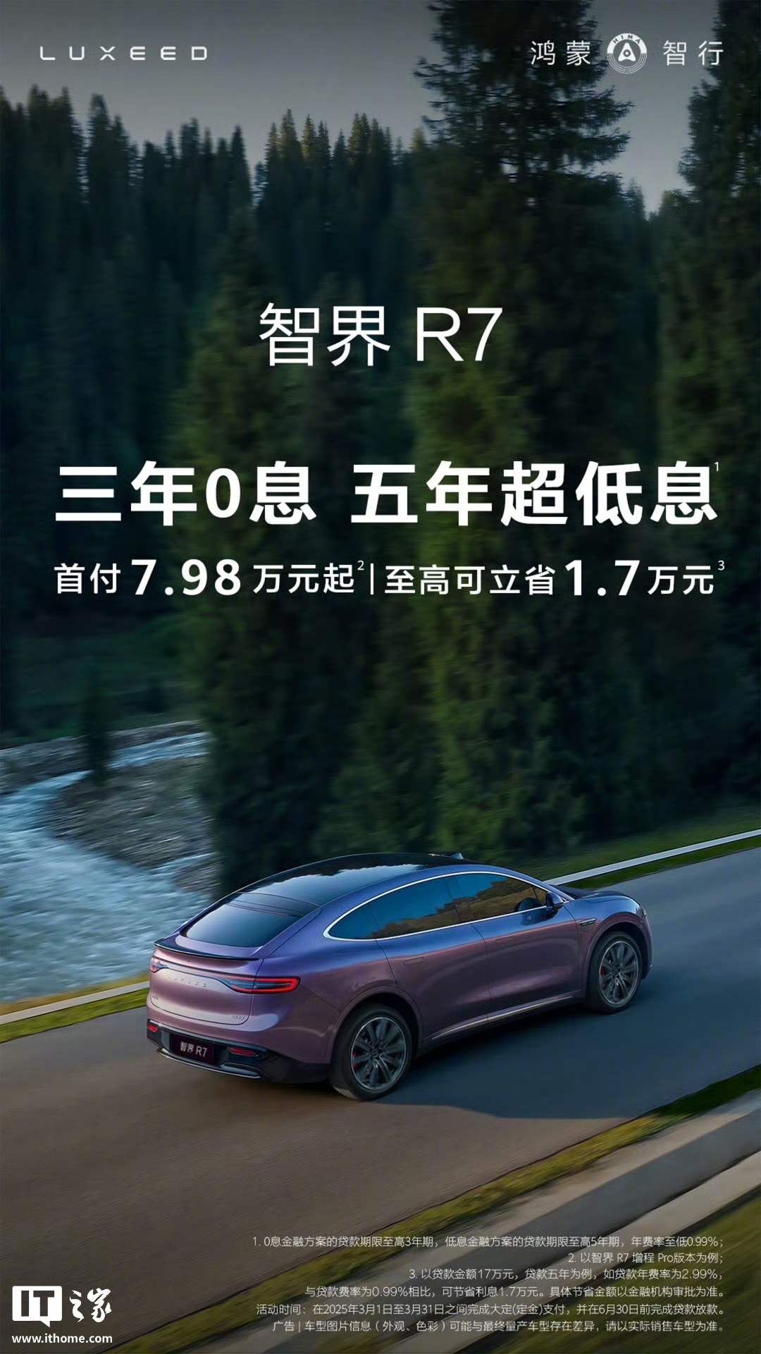 鸿蒙智行官微本月(3 月 1 日)宣布,智界 R7 推出 3 年 0 息、5 年超低息限时金融政策,即日起购车首付 7.98 万元起,至高可省 1.7 万元。