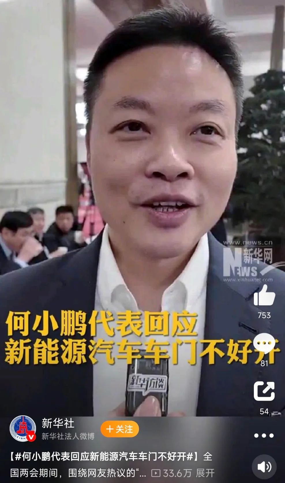 3月8日举行的全国两会第二场“代表通道”集中采访活动结束后,有记者向登场的小鹏汽车董事长何小鹏追问“为什么新能源车门都不好开”,再次激发了人们对隐藏式门把手的巨量吐槽。