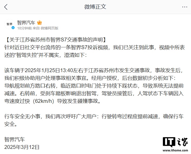 IT之家注意到,针对这一事件,智界汽车官方于刚刚通过其官方微博发布了《关于江苏省苏州市智界 S7 交通事故的声明》。声明指出,官方已关注到该事件,视频中所表述的“智驾失控”并不属实。