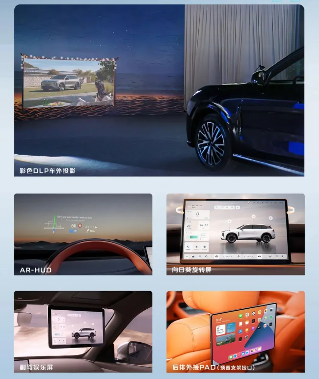 Q07 的五屏分别是向日葵旋转屏、副驾娱乐屏、AR-HUD、彩色 DLP 车外投影以及后测外接 PAD(预留支架接口),唯一智慧五联屏。