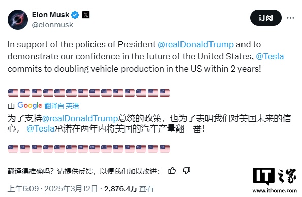 IT之家 3 月 12 日消息,在美国总统特朗普于周二在白宫购买特斯拉汽车后,特斯拉首席执行官埃隆・马斯克承诺将大幅提高特斯拉在美国的汽车生产能力。