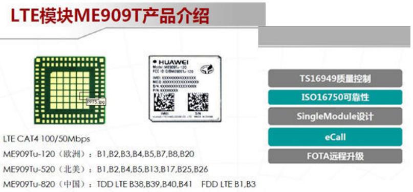 历时四年,2013年12月4日,华为在上海浦东四季酒店,正式公布了其研发成果:车载通信模块产品ME909T。这是一款高兼容性、高集成性、高稳定性且支持多种制式和全球导航卫星系统、全球运营商准入协议、FOTA(远程固件升级)等功能的优秀产品。