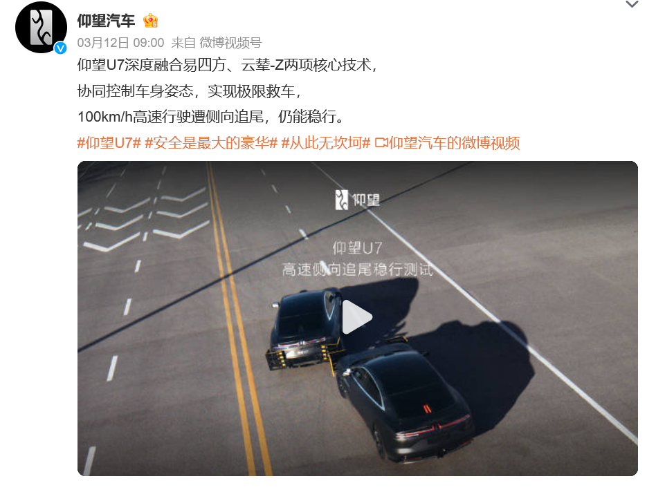 近日,该车一项硬核安全性能测试引发关注 —— 官方披露,仰望U7在100km/h高速行驶状态下遭遇侧向追尾,仍能保持稳行,其技术底气源于深度融合的易四方、云辇-Z两项核心技术。