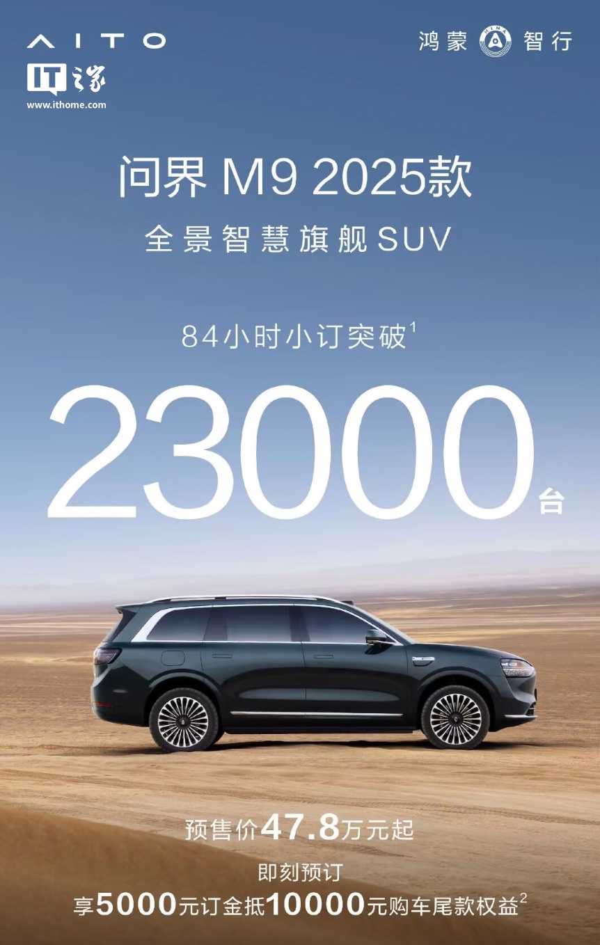 《鸿蒙智行新车 84 小时小订“成绩单”公布:问界 M8 破 4.7 万台,新款 M9 破 2.3 万台》