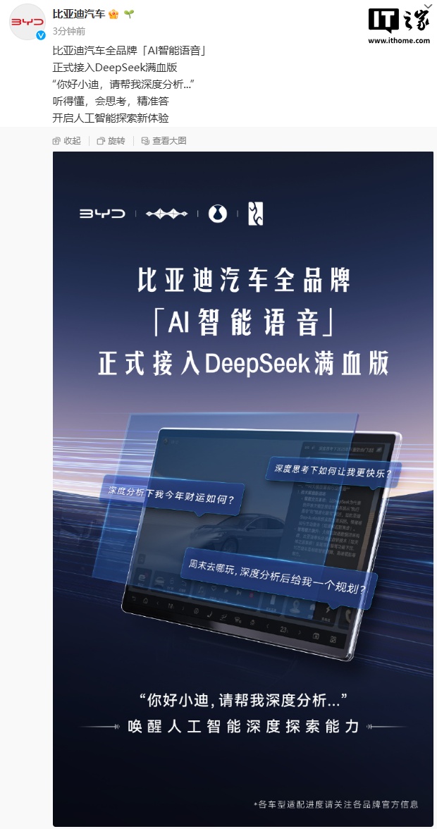 IT之家 3 月 13 日消息,比亚迪汽车今日宣布,旗下全品牌“AI 智能语音”正式接入 DeepSeek 满血版。