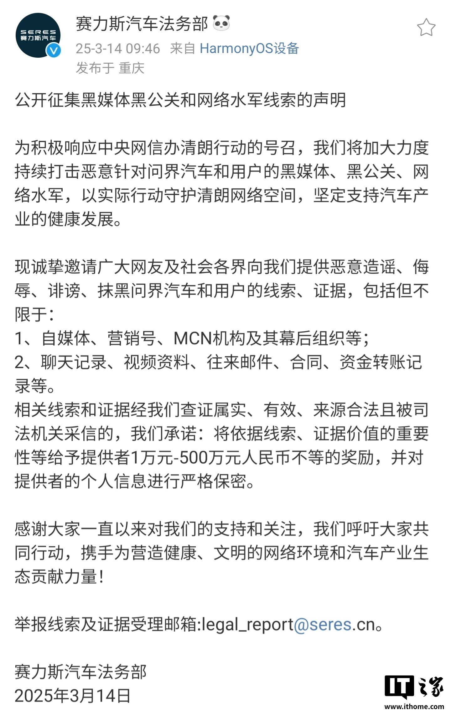 IT之家 3 月 14 日消息,今日,赛力斯汽车法务部公开征集黑媒体黑公关和网络水军线索。IT之家附原文如下: