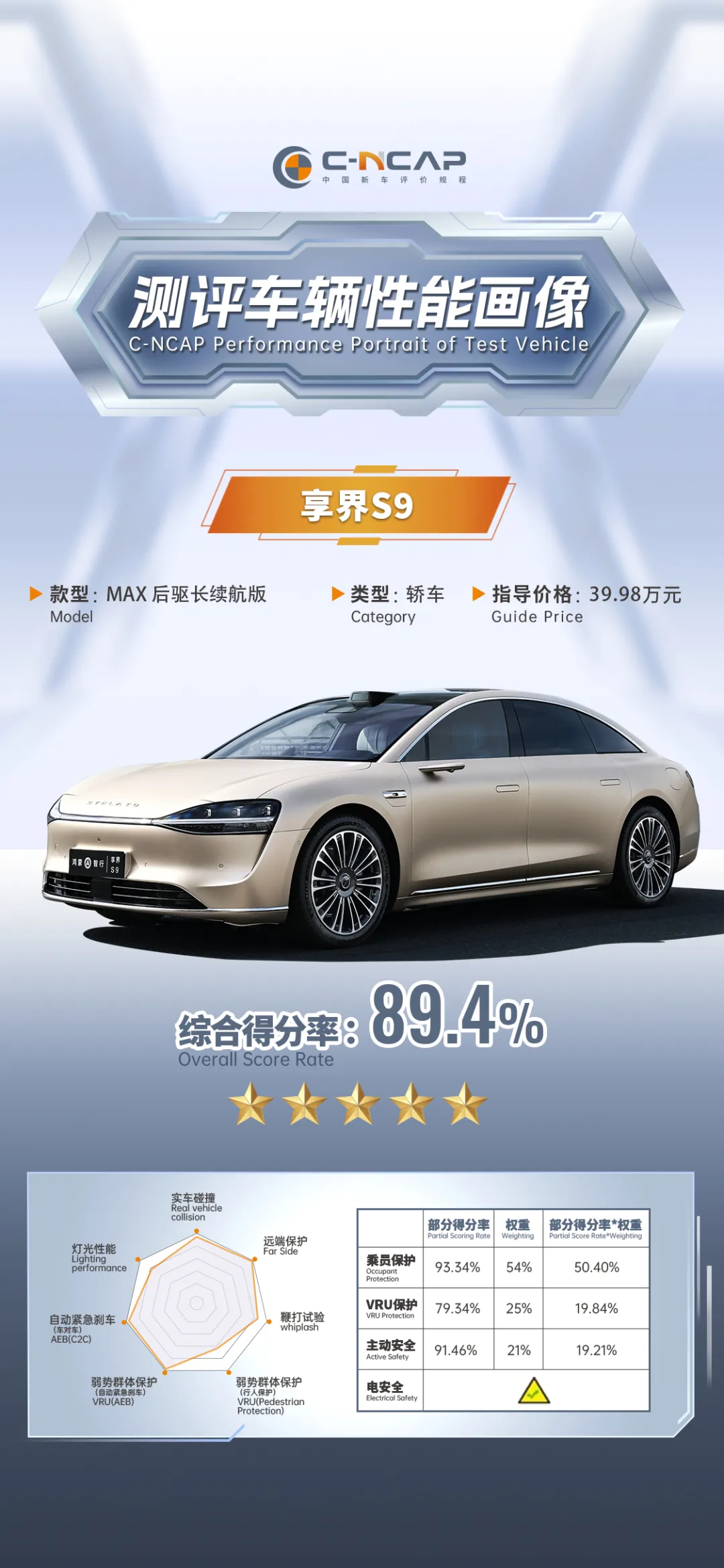 综合得分率:享界 S9 为 89.4%,高于已测车型平均得分率 83.8%