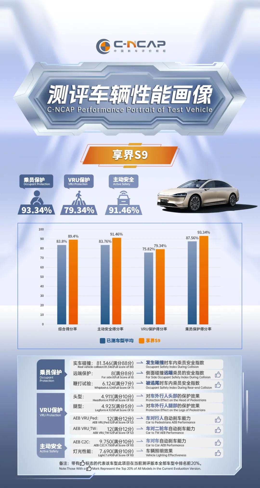 乘员保护得分率:享界 S9 为 93.34%,高于已测车型平均得分率 87.56%
