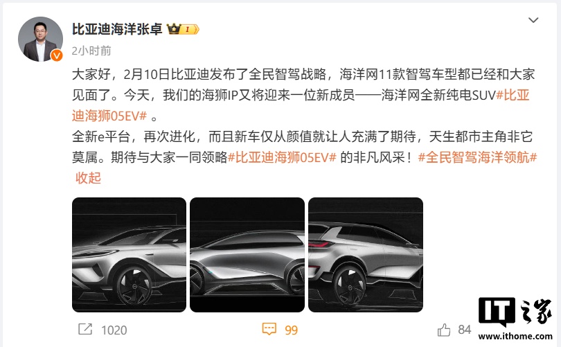 IT之家 3 月 14 日消息,比亚迪汽车海洋网销售事业部总经理张卓今日在微博发文称,海狮 IP 将迎来一位新成员 —— 海洋网全新纯电 SUV 比亚迪海狮 05 EV。