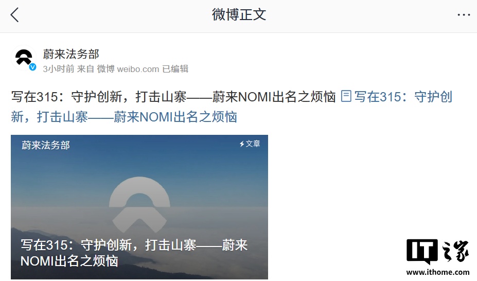 IT之家 3 月 15 日消息,蔚来法务部今日发布文章《写在 315:守护创新,打击山寨 —— 蔚来 NOMI 出名之烦恼》,称市场上出现了大量严重侵权行为,包括山寨 NOMI 机器头、粗暴复制抄袭表情设计等。
