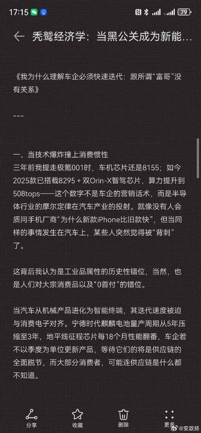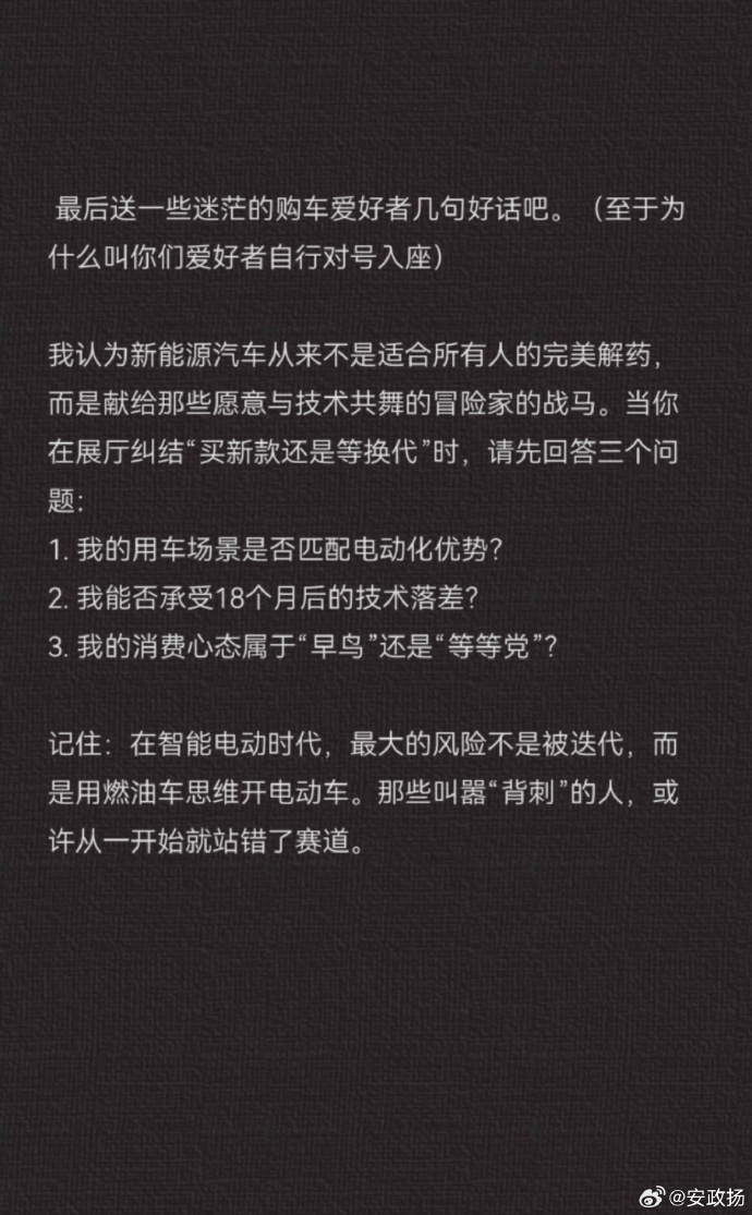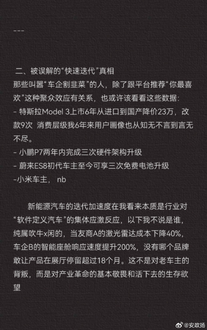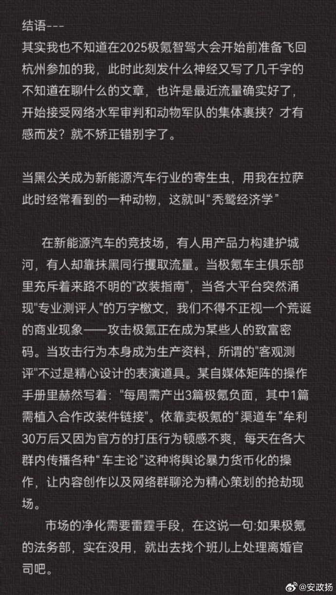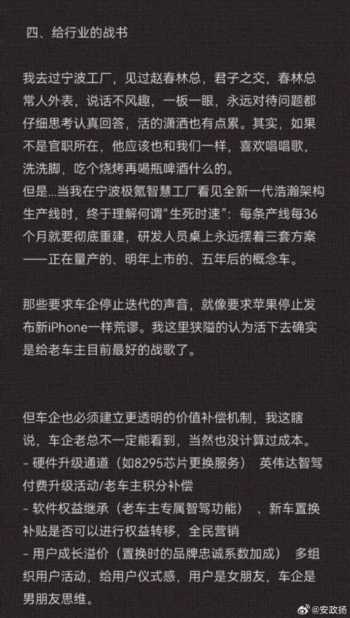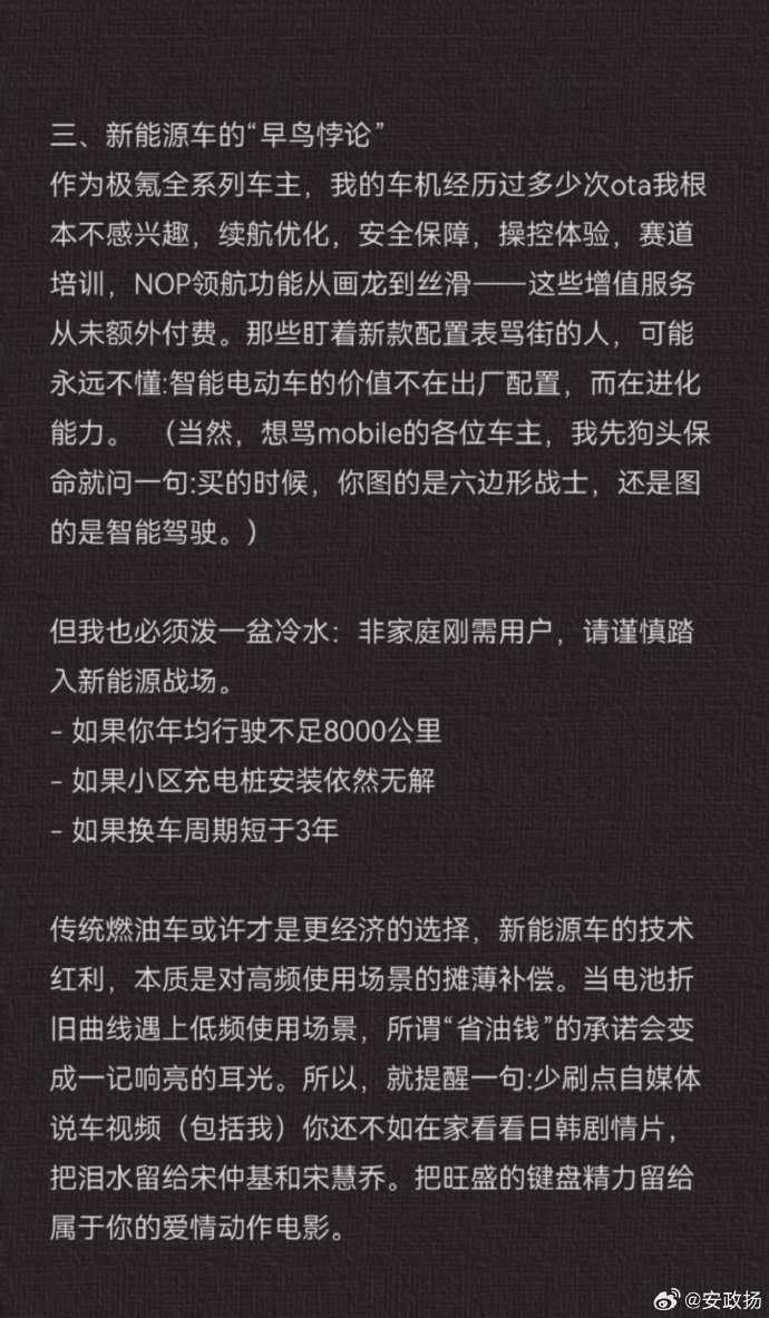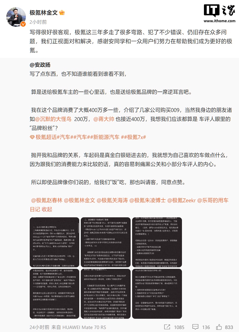 安政扬提到,自己想为“自己喜欢的车”做点什么,已在这个品牌消费了 400 万元有余,并送给极氪车主“一些心里话”,送给极氪品牌“一席逆耳言”。林金文表示,该博主发表的观点“很好很客观”。
