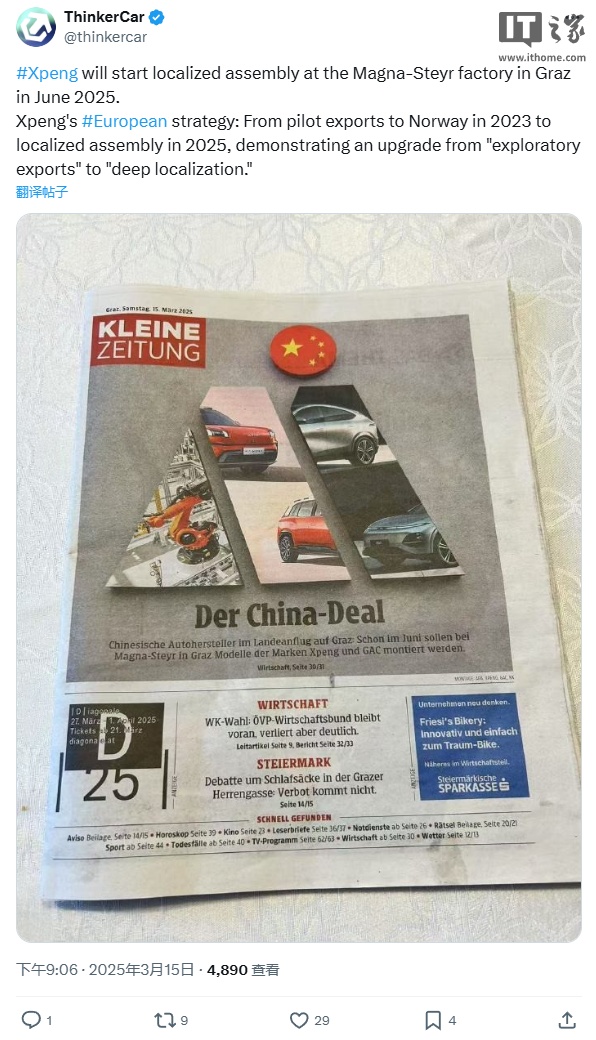 IT之家 3 月 17 日消息,德国媒体《克莱恩报》3 月 15 日称,小鹏、广汽将从 6 月开始在奥地利格拉茨的麦格纳斯太尔(Magna Steyr)工厂进行生产,初期阶段只有 SKD 半散件方式组装的特殊车型。