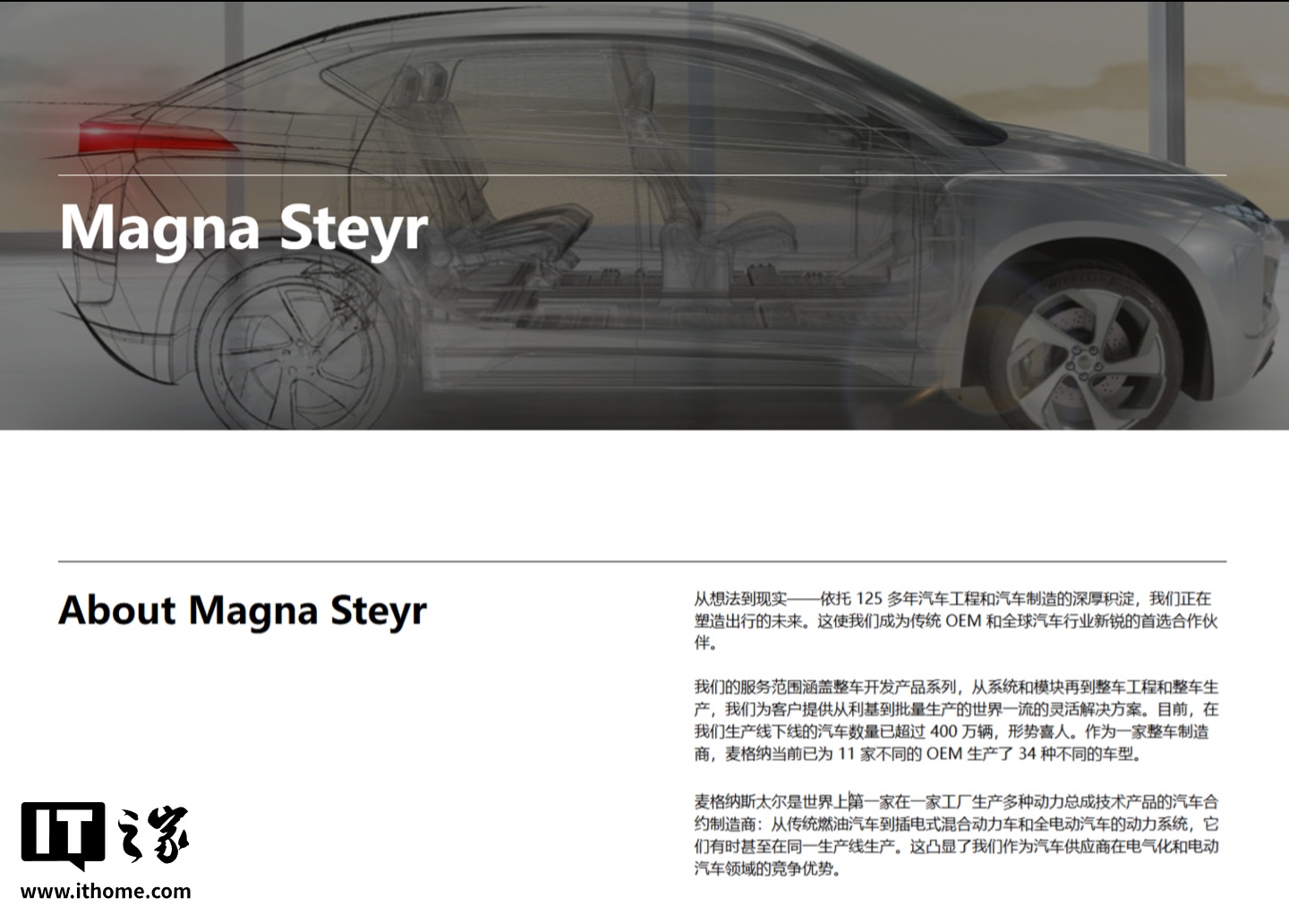 IT之家查询获悉,麦格纳斯太尔原属斯太尔-戴姆勒-普赫,现是麦格纳的子公司,是全球汽车业最大的合约制造商。作为一家整车制造商,麦格纳至少已为 11 家不同的 OEM 厂商生产了 34 种不同的车型(如梅赛德斯-奔驰、奥迪、菲亚特和标致汽车)。