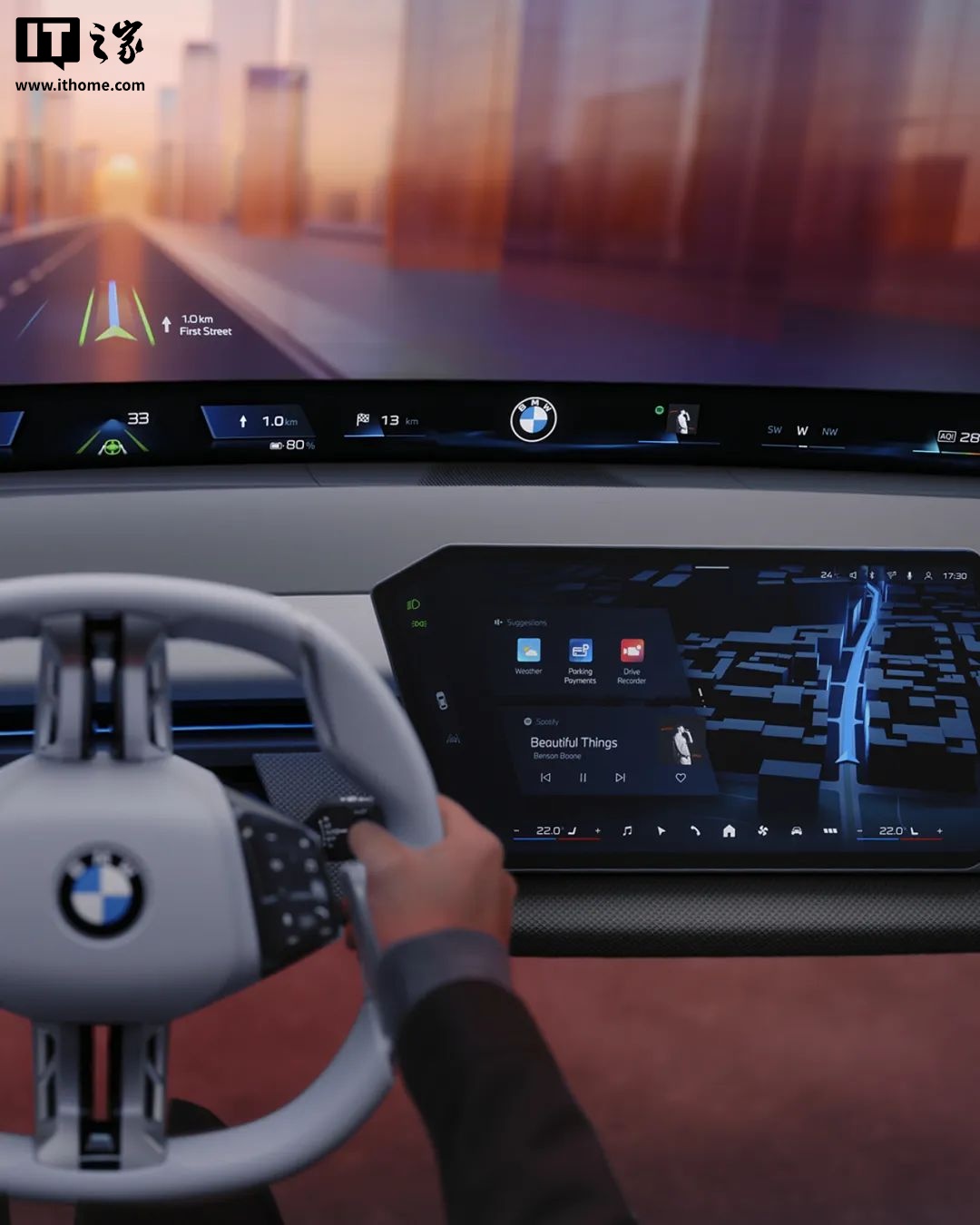 今年 1 月 8 日,宝马在 2025 年美国国际消费电子展(CES)上首发新世代超感智能座舱 ——BMW 首创全景 iDrive 和 BMW 新世代操作系统 X。BMW 首创全景 iDrive 涵盖车内四大全新交互界面、行业首创的视平线全景显示、全新 3D 抬头显示、超感智控方向盘以及 BMW 首创向心中控。