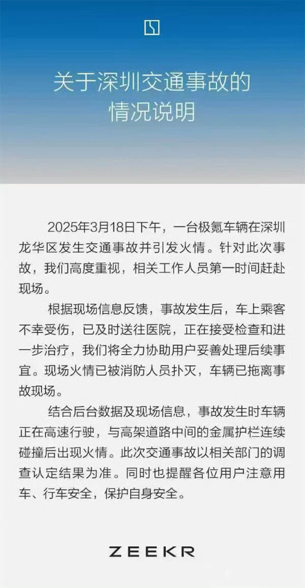 IT之家注意到,同日,极氪汽车发布深圳交通事故的情况说明,称 3 月 18 日下午,一台极氪车辆在深圳龙华区发生交通事故并引发火情。相关工作人员第一时间赶赴现场。根据现场信息反馈,事故发生后,车上乘客不幸受伤,已被及时送往医院,正在接受检查和进一步治疗,极氪将全力协助用户妥善处理后续事宜。现场火情已被消防人员扑灭,车辆已拖离事故现场。