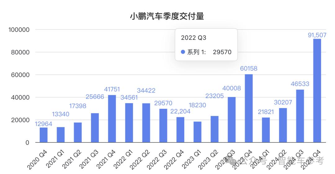 从季度交付量的历史趋势变化来看,小鹏汽车的业绩明显以2022年三季度为一个分界点: