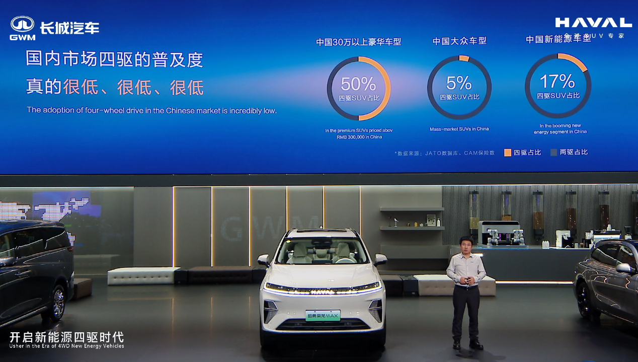 哈弗品牌表示,中国大众车型四驱 SUV 占比仅有 5%,中国新能源车型四驱 SUV 占比仅有 17%,因此哈弗的目标是让每个家庭都能够享受四驱。
