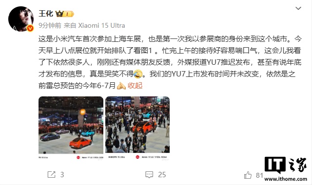 对此,小米集团公关部总经理王化回应称:YU7 上市发布时间并未改变,依然是之前雷总预告的今年 6-7 月。
