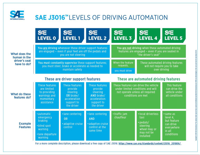 国际自动机工程师学会(SAE International)给自动驾驶汽车的智能程度,从低到高定义了L0到L5共6个级别(SAE J3016)。由中国工信部牵头制定的国标GB/T 40429-2021《汽车驾驶自动化分级》中也采用了与SAE J3016基本一致的汽车自动化分级方式。
