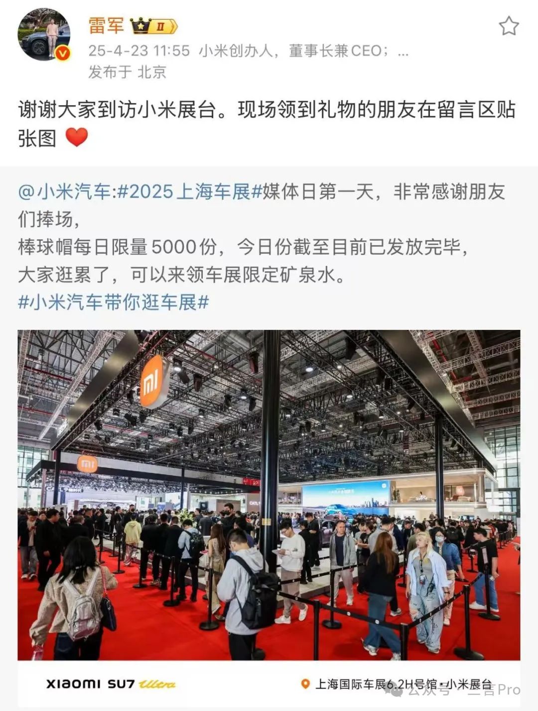 小米汽车也发文称,棒球帽每日限量5000份,今日份截至目前已发放完毕,大家逛累了,可以来领车展限定矿泉水。