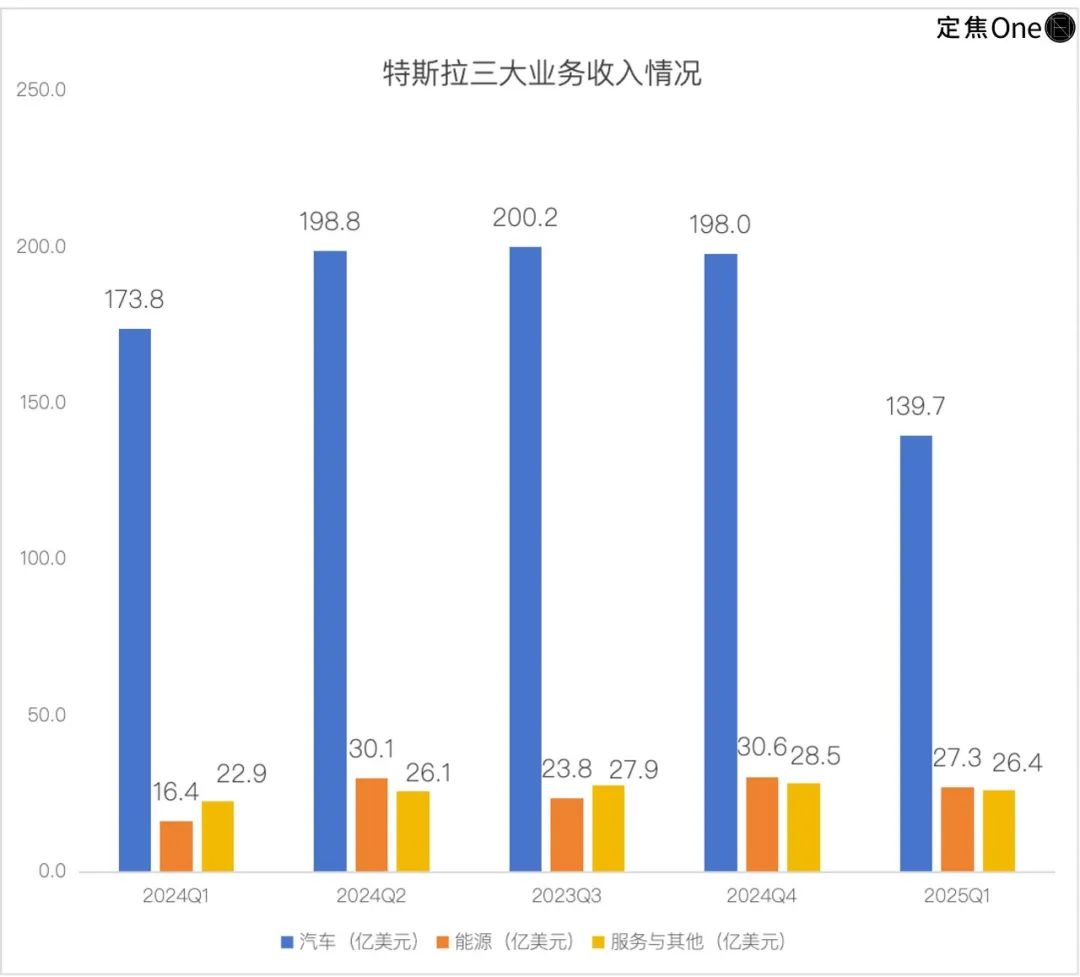 2025年一季度,特斯拉总营收193亿美元,同比下跌9%,低于市场预期,主要是因为卖车生意拖了后腿:全球交付量33.67万,比上一年同期少了5万辆,汽车收入直接缩水两成到139.7亿美元,相当于每天少进账近4000万美元;