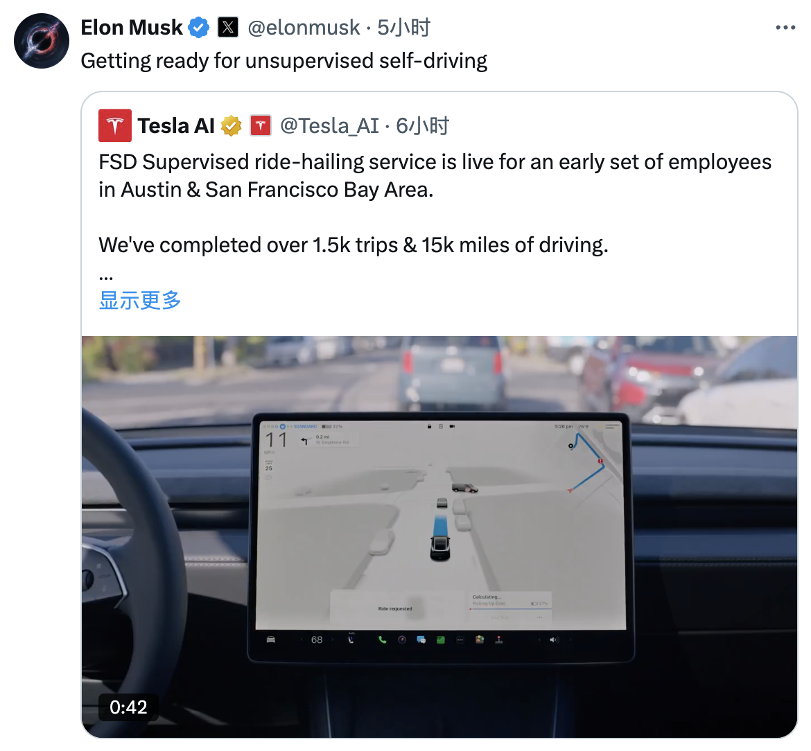 “正为无人监督的自动驾驶做准备。”特斯拉CEO埃隆·马斯克(Elon Musk)发文回应该视频称。