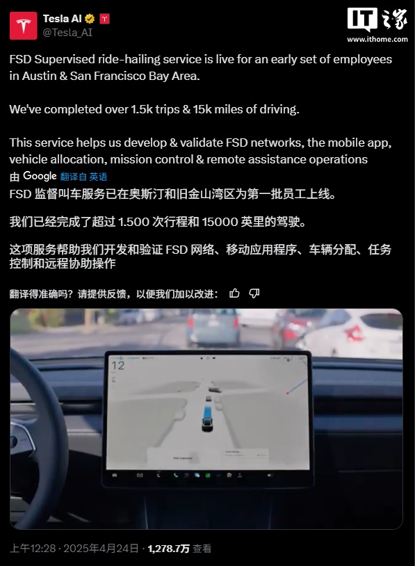 IT之家 4 月 24 日消息,特斯拉已开始在奥斯汀和旧金山湾区面向员工测试其自动驾驶打车服务,为公司计划于今年夏季推出的无人出租车服务做准备。该公司周三在 X 网站上宣布,“FSD 监督的网约车服务已在奥斯汀和旧金山湾区向首批员工开放”。