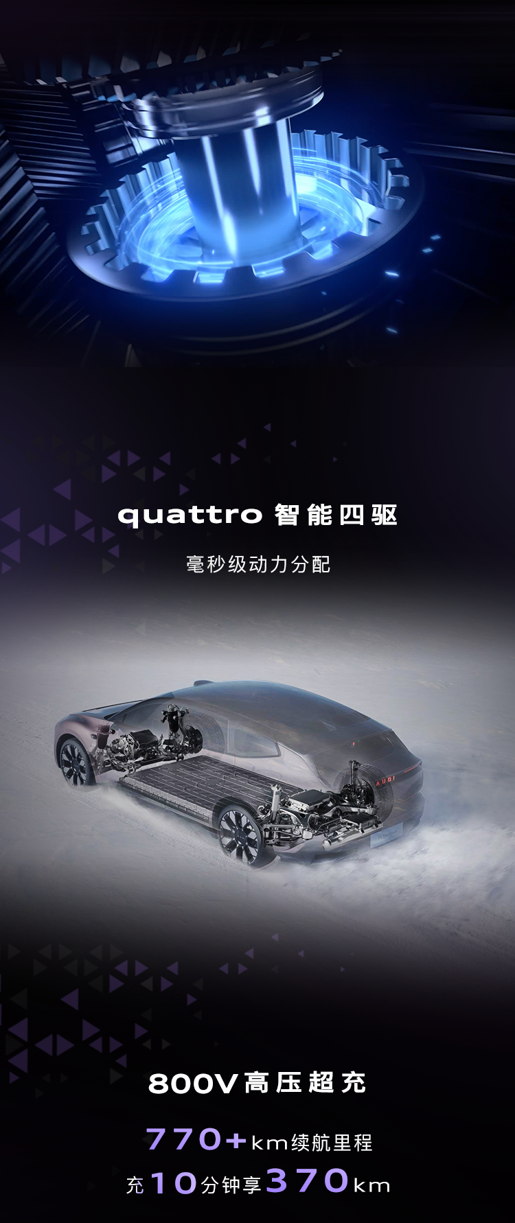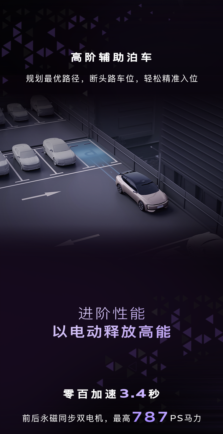 该车搭载双电机四驱动力系统,全系 800V 架构、超 700km 续航,零百加速 3.4 秒。