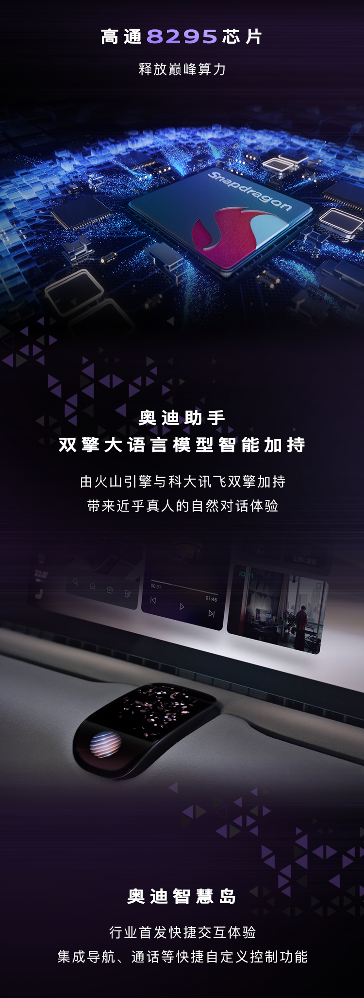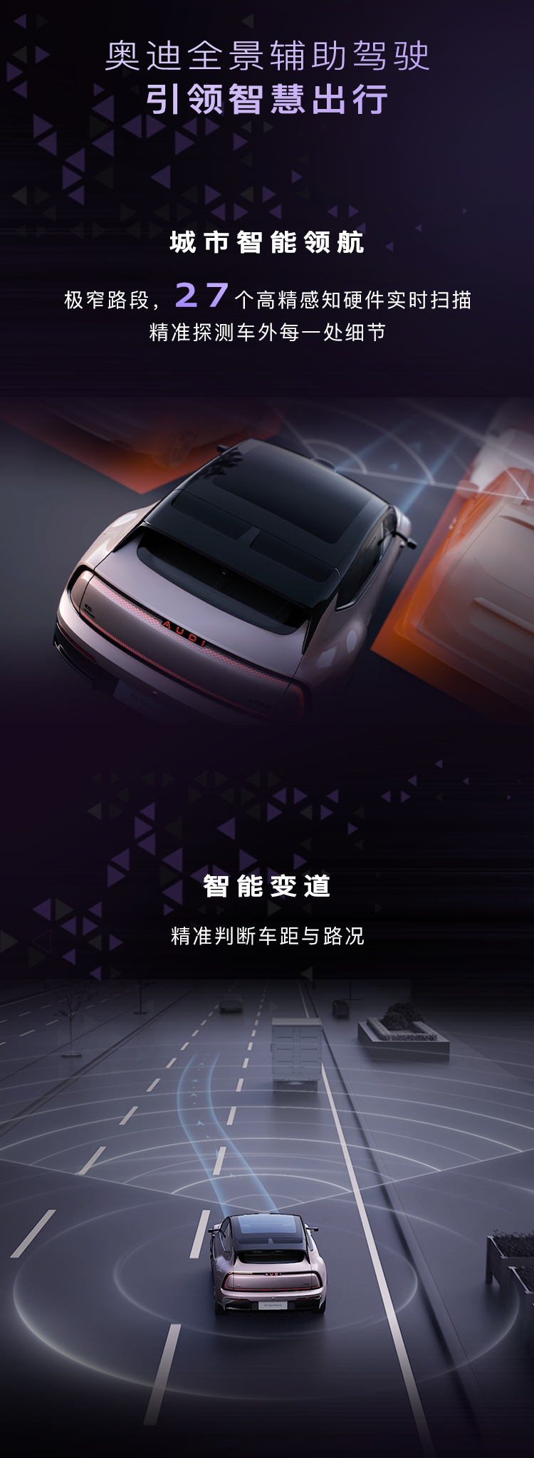 该车还搭载奥迪全景辅助驾驶,支持城市智能领航、智能变道、高阶辅助泊车。