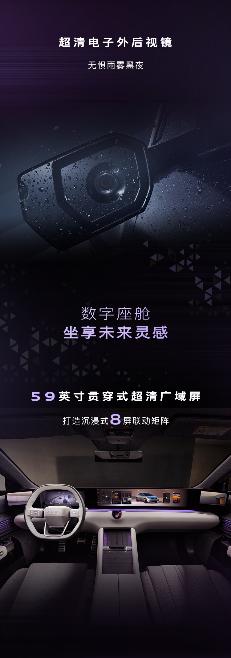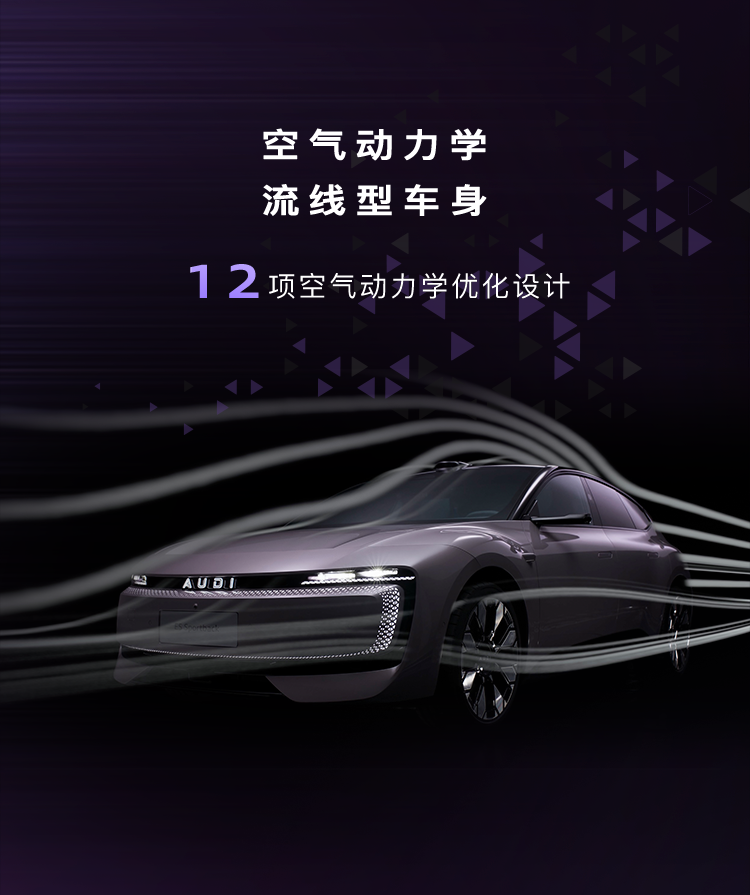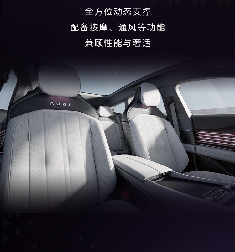 AUDI E5 Sportback 是一款 B 级纯电动 Sportback 车型,搭载环形 LED 灯带、可发光字母标识等。