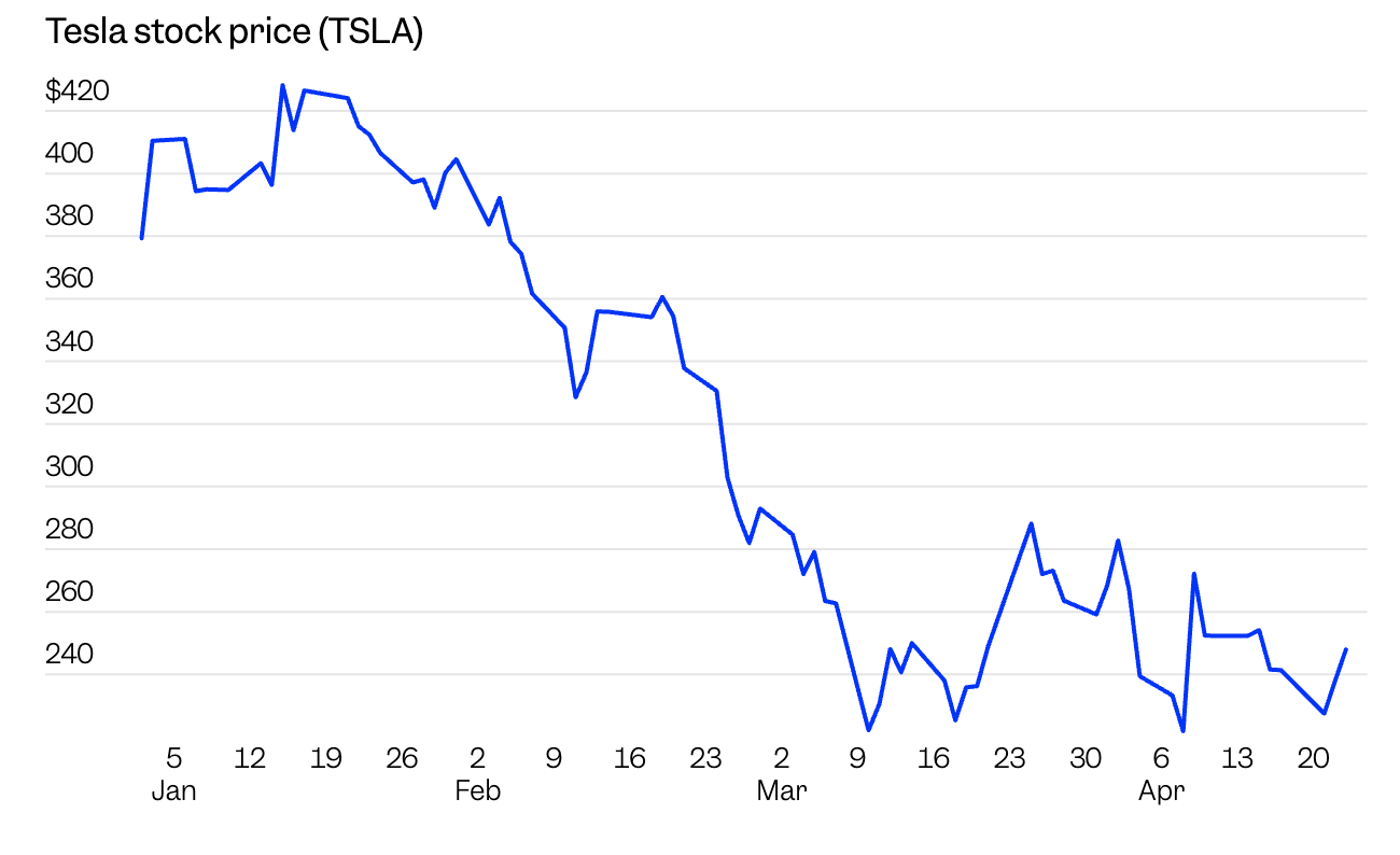 特斯拉目前的股价和历史高点相比也出现了大幅下滑。截至周三,其股价较今年年初的水平下跌了35%。