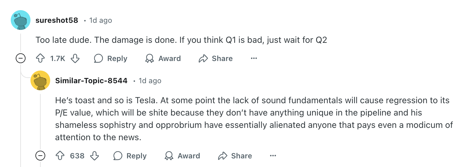 “太晚了,哥们。伤害已经造成了。如果你觉得第一季度业绩很糟糕,那就等着看第二季度吧。”一位用户在Reddit论坛散户投资者板块r/WallStreetBets上写道。