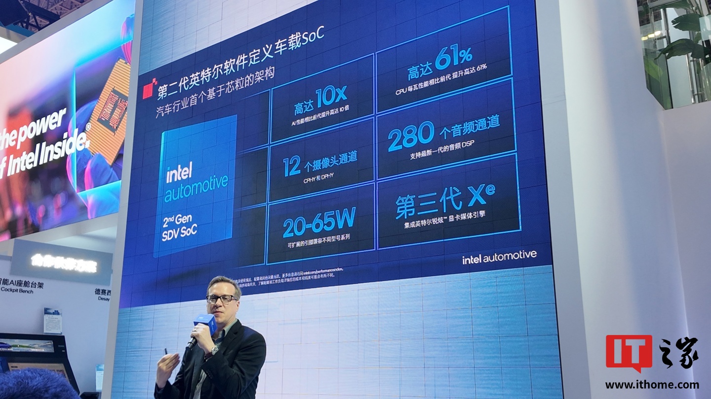 IT之家 4 月 24 日消息,根据IT之家拍摄的 2025 上海车展图片,英特尔官方在现场介绍第二代英特尔 SDV SoC 时表示,该芯片搭载“第三代 Xe”,集成英特尔锐炫显卡媒体引擎。